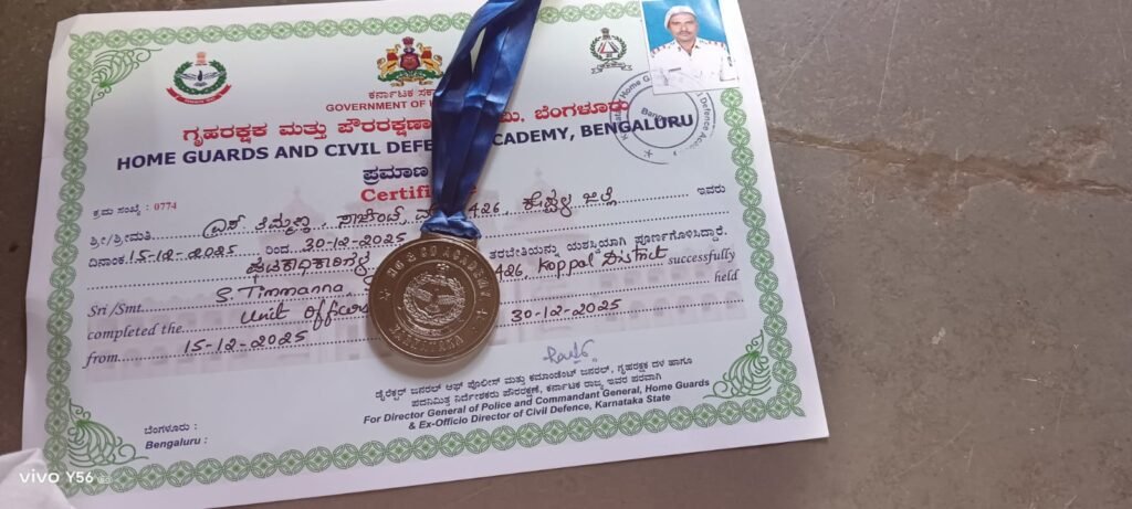 ಗಂಗಾವತಿ.. ಎಸ್ ತಿಮ್ಮಣ್ಣ ಸಾರ್ಜೆಂಟ್ ಕಾರಟಗಿ ಗೃಹರಕ್ಷಕ ದಳ ಘಟಕ ಅಧಿಕಾರಿ ಜಿಲ್ಲಾ ಕೊಪ್ಪಳ ಇವರಿಗೆ ಬೆಂಗಳೂರು ತರಬೇತಿ ಅಕಾಡೆಮಿಯ ಮಹಾಸಮಾದಿ ಷ್ಠರು ಮಾನ್ಯ ಶ್ರೀಮತಿ ರಶ್ಮಿ IPS ಮೇಡಂ.ಉಪಸಮಾದಿಷ್ಟರು ಪದ್ಮಾಕ್ಷಿ ಮೇಡಂ ಪೊಲೀಸ್ ಮಹಾ ನಿರ್ದೇಶಕರ ಕಚೇರಿ, ಗೃಹರಕ್ಷಕ ಹಾಗೂ ಪೌರ ರಕ್ಷಣೆ ಮತ್ತು ಅಗ್ನಿಶಾಮಕ ತುರ್ತು ಸೇವೆ ಗಳು ಬೆಂಗಳೂರು ರವರಿಂದ ಬೆಳ್ಳಿ ಪದಕ ಪ್ರಧಾನ ನೀಡಲಾಯಿತು ದಶಕಗಳ ಕಾಲ ಗ್ರಹ ರಕ್ಷಕರಾಗಿ. ಹಾಗೂ ಕಾರ್ಟಿಗಿಯ ಸಾರ್ಜೆಂಟ್ ಆಗಿ ಕರ್ತವ್ಯ ನಿರ್ವಹಿಸುತ್ತಿರುವ ಎಸ್ ತಿಮ್ಮಣ್ಣ ಅವರಿಗೆ ಅವರ ಸೇವೆಯನ್ನು ಪರಿಗಣಿಸಿ ಕರ್ನಾಟಕ ರಾಜ್ಯ ಪೊಲೀಸ್ ಮಹಾ ನಿರ್ದೇಶಕರ ಕಚೇರಿ ಗೃಹರಕ್ಷಕ ಹಾಗೂ ಪೌರ ರಕ್ಷಣೆ ಹಾಗೂ ಅಗ್ನಿಶಾಮಕ ತುರ್ತು ಸೇವೆಗಳು ಅಕಾಡೆಮಿ ಬೆಂಗಳೂರು ಗೃಹರಕ್ಷಕರ ಅಧಿಕಾರಿಗಳ ತರಬೇತಿಯಲ್ಲಿ ಬೆಳ್ಳಿ ಪದಕವನ್ನು ಪಡೆದುಕೊಂಡ ಎಸ್ ತಿಮ್ಮಣ್ಣ ಸಾರ್ಜೆಂಟ್ ಕಾರಟಗಿ ಅವರಿಗೆ ಕೊಪ್ಪಳ ಜಿಲ್ಲೆ ತರಬೇತಿ ಉಪಸಮಾದಿಸ್ಟ್ ರು ಶ್ರೀಮತಿ ಪದ್ಮಾಕ್ಷಮೇಡಂ ಅವರಿಂದ ಬೆಳ್ಳಿ ಪದಕ ಸೇರಿದಂತೆ ಪ್ರಶಸ್ತಿ ಪತ್ರವನ್ನು ನೀಡಿ ಗೌರವಿಸಿದರು. ಈ ಸಂದರ್ಭದಲ್ಲಿ ಪದ್ಮಾಕ್ಷಾ ಮೇಡಮ್ ಮಾತನಾಡಿ ಗೃಹರಕ್ಷಕ ದಳ. ಪೋಲೀಸ್ ಇಲಾಖೆಗಳಲ್ಲಿ ಹಾಗೂ ಇತರೆ ಇಲಾಖೆಗಳೊಂದಿಗೆ ಸೇವೆ ಸಲ್ಲಿಸುತ್ತಿದ್ದು ಅತ್ಯಂತ ಪ್ರಾಮಾಣಿಕವಾಗಿ ಅಗತ್ಯ ತುರ್ತು ಸಂದರ್ಭಗಳಲ್ಲಿ ಸೇವೆ ಸಲ್ಲಿಸುವ ವ್ಯಕ್ತಿಗಳನ್ನು ಗುರುತಿಸಿ ಪ್ರಶಸ್ತಿ ಪದಕಗಳನ್ನು ನೀಡಲಾಗುತ್ತದೆ ಅತಿವೃಷ್ಟಿ ಅನಾವೃಷ್ಟಿ. ಬೆಂಕಿ ಅವಘಡ. ಜಲಕಂಠಕ. ಸಂದರ್ಭಗಳಲ್ಲಿ ತಮ್ಮ ಜೀವನದ ಹಂಗನ್ನು ತೊರೆದು ಜೀವ ರಕ್ಷಕರಾಗಿ ಸೇವೆ ಸಲ್ಲಿಸಿದ ಗೃಹರಕ್ಷಕರು ಅವರ ಸೇವೆ ಅತ್ಯಂತ. ಶಾ ಗ್ಲ ನೀಯ ವಾಗಿದೆ. ಈ ಪ್ರಶಸ್ತಿ ಇತರೆ ಗ್ರಹ ರಕ್ಷಕ ದಳದವರಿಗೆ ಮಾದರಿಯಾಗಲಿಎಂದು ತಿಳಿಸಿದರು..
