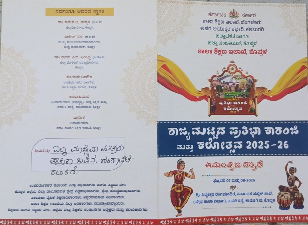 ಕಾರಟಗಿ. ಕರ್ನಾಟಕ ಸರ್ಕಾರ ಶಾಲಾ ಶಿಕ್ಷಣ ಇಲಾಖೆ ಬೆಂಗಳೂರು ಅಪರ ಆಯುಕ್ತರ ಕಚೇರಿ ಕಲ್ಬುರ್ಗಿ ಜಿಲ್ಲಾಡಳಿತ ಹಾಗೂ ಜಿಲ್ಲಾ ಪಂಚಾಯತ್ ಕೊಪ್ಪಳ ಶಾಲಾ ಶಿಕ್ಷಣ ಇಲಾಖೆ, ಕೊಪ್ಪಳ ಇವರ ನೇತೃತ್ವದಲ್ಲಿ ರಾಜ್ಯಮಟ್ಟದ ಪ್ರತಿಭಾ ಕಾರಂಜಿ ಕಲೋತ್ಸವ 2025….26 ಇದೇ ದಿನಾಂಕ 7 ಮತ್ತು 8ರಂದು ಶ್ರೀ ಸಿದ್ದೇಶ್ವರ ರಂಗ ಮಂದಿರ ಕರ್ನಾಟಕ ಪಬ್ಲಿಕ್ ಶಾಲೆ ಪ್ರೌಢಶಾಲಾ ವಿಭಾಗ ನವಲಿ ರಸ್ತೆ ಕಾರ್ಟಿಗಿಯಲ್ಲಿ ಜರುಗಲಿದೆ. ದಿನಾಂಕ 7 ರಂದು ಬೆಳಿಗ್ಗೆ 10 ಗಂಟೆಗೆ ವಿಧಾನಪರಿಷತ್ ಸಭಾಪತಿಗಳಾದ ಬಸವರಾಜ ಹೊರಟ್ಟಿ ಅವರ ಘನ ಉಪಸ್ಥಿತಿಯಲ್ಲಿ ಶಿಕ್ಷಣ ಸಚಿವ ಎಸ್ ಮಧು ಬಂಗಾರಪ್ಪ ಸಮಾರಂಭವನ್ನು ಉದ್ಘಾಟಿಸುವರು ಅಧ್ಯಕ್ಷತೆ ಮತ್ತು ಸ್ಪರ್ಧಿಗಳ ಉದ್ಘಾಟನೆಯನ್ನು ಕನ್ನಡ ಮತ್ತು ಸಂಸ್ಕೃತಿ ಇಲಾಖೆಯ ಹಾಗೂ ಹಿಂದುಳಿದ ವರ್ಗಗಳ ಕಲ್ಯಾಣ ಮತ್ತು ಕೊಪ್ಪಳ ಜಿಲ್ಲಾ ಉಸ್ತುವಾರಿ ಸಚಿವ ಶಿವರಾಜ್ ತಂಗಡಗಿ ನೆರವೇರಿಸುವವರು . ವಿಶೇಷ ಅತಿಥಿಗಳಾಗಿ ಮುಖ್ಯ ಸಚೇತಕ ವಿರೋಧ ಪಕ್ಷದ ನಾಯಕ ದುಡ್ಡನಗೌಡ ಪಾಟೀಲ್. ಮುಖ್ಯಮಂತ್ರಿಗಳ ಆರ್ಥಿಕ ಸಲಹೆಗಾರ ಬಸವರಾಜ್ ರಾಯರೆಡ್ಡಿ ಸೇರಿದಂತೆ ಜಿಲ್ಲಾ ಸಂಸದ ರಾಜಶೇಖರ ಹಿಟ್ನಾ ಳ್ ಸೇರಿದಂತೆ ಜಿಲ್ಲೆಯ ಎಲ್ಲಾ ವಿಧಾನಸಭೆಗಳ ಶಾಸಕರು ವಿಧಾನಪರಿಷತ್ ಸದಸ್ಯರು ಹಾಲಿ ಮಾಲಿ ಪ್ರತಿನಿಧಿಗಳು ಸೇರಿದಂತೆ ಉನ್ನತ ಅಧಿಕಾರಿಗಳು. ಜಿಲ್ಲಾಧಿಕಾರಿಗಳು ಇತರರು ಭಾಗವಹಿಸುವುದು ಎಂದು ಶಿಕ್ಷಣ ಇಲಾಖೆ ಪ್ರಕಟಣೆ ಯಲ್ಲಿ ತಿಳಿಸಿದ್ದಾರೆ.