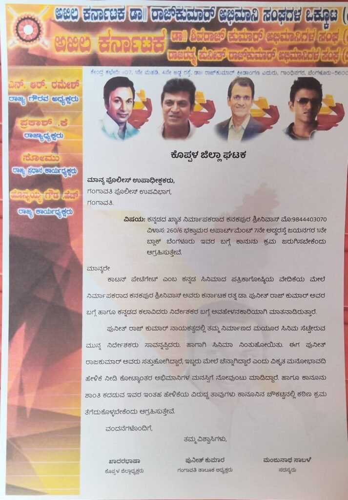 ಈ ಹಿನ್ನೆಲೆಯಲ್ಲಿಯೇ “ಈಗ ಪುನೀತ್ ರಾಜ್ಕುಮಾರ್ ಸತ್ತು ಹೋಗಿದ್ದಾರೆ, ಇಬ್ಬರು ಮೇಲೆ ಚೆನ್ನಾಗಿದ್ದಾರೆ” ಎಂಬ ಅಸಂಬದ್ಧ ಹಾಗೂ ವಿಕೃತ ಮನೋಭಾವದ ಹೇಳಿಕೆಯನ್ನು ನೀಡಿ ಕೋಟ್ಯಾಂತರ ಅಭಿಮಾನಿಗಳ ಮನಸ್ಸಿಗೆ ಆಘಾತ ಉಂಟು ಮಾಡಿದ್ದಾರೆ ಎಂದು ಆರೋಪಿಸಲಾಗಿದೆ.ಈ ರೀತಿಯ ಹೇಳಿಕೆಗಳು ಸಾರ್ವಜನಿಕ ಶಾಂತಿ ಕದಡುವುದಲ್ಲದೆ, ದಿವಂಗತ ಮಹಾನ್ ಕಲಾವಿದರ ಗೌರವಕ್ಕೆ ಧಕ್ಕೆ ತರುವಂತಿದ್ದು, ಸಮಾಜದಲ್ಲಿ ಅಶಾಂತಿ ಸೃಷ್ಟಿಸುವ ಸಾಧ್ಯತೆ ಇದೆ ಎಂದು ಕನ್ನಡಾಭಿಮಾನಿಗಳು ಅಭಿಪ್ರಾಯಪಟ್ಟಿದೆ.ಈ ಹಿನ್ನೆಲೆಯಲ್ಲಿ ಎನ್.ಆರ್. ರಮೇಶ್ ಅವರ ಆದೇಶದ ಮೇರೆಗೆ ಗಂಗಾವತಿ ಪೊಲೀಸ್ ಉಪವಿಭಾಗದ ಮಾನ್ಯ ಉಪಾಧೀಕ್ಷಕರಿಗೆ ಮನವಿ ಸಲ್ಲಿಸಲಾಗಿದ್ದು, ಸಂಬಂಧಿಸಿದವರ ವಿರುದ್ಧ ಕಾನೂನಿನ ಚೌಕಟ್ಟಿನಲ್ಲಿ ಕಠಿಣ ಕ್ರಮ ಕೈಗೊಳ್ಳಬೇಕೆಂದು ಡಾll.ರಾಜಕುಮಾರ್ ಅಭಿಮಾನಿ ಸಂಘಗಳ ಒಕ್ಕೂಟದ ಕೊಪ್ಪಳ ಜಿಲ್ಲಾಧ್ಯಕ್ಷ ಖಾದರ್ ಭಾಷಾ ಹಾಗೂ ಗಂಗಾವತಿ ತಾಲೂಕು ಅಧ್ಯಕ್ಷ ಪುನೀತ್ ಕುಮಾರ್ ಸೇರಿದಂತೆ ಸಂಘದ ಸದಸ್ಯರು ಆಗ್ರಹಿಸಿದ್ದಾರೆ.ಈ ಸಂದರ್ಭದಲ್ಲಿ ಡಾll.ರಾಜಕುಮಾರ್ ಅಭಿಮಾನಿ ಸಂಘಗಳ ಒಕ್ಕೂಟದ ಕೊಪ್ಪಳ ಜಿಲ್ಲಾಧ್ಯಕ್ಷ ಖಾದರ್ ಭಾಷಾ, ಹಾಗೂ ಗಂಗಾವತಿ ತಾಲೂಕು ಅಧ್ಯಕ್ಷ ಪುನೀತ್ ಕುಮಾರ್, ಮತ್ತು ಸಂಘದ ಸದಸ್ಯರಾದ ಮಂಜುನಾಥ್ ಸಾಬಳೆ, ಈ ಸಂದರ್ಭದಲ್ಲಿ ಉಪಸಿತರಿದ್ದರು.