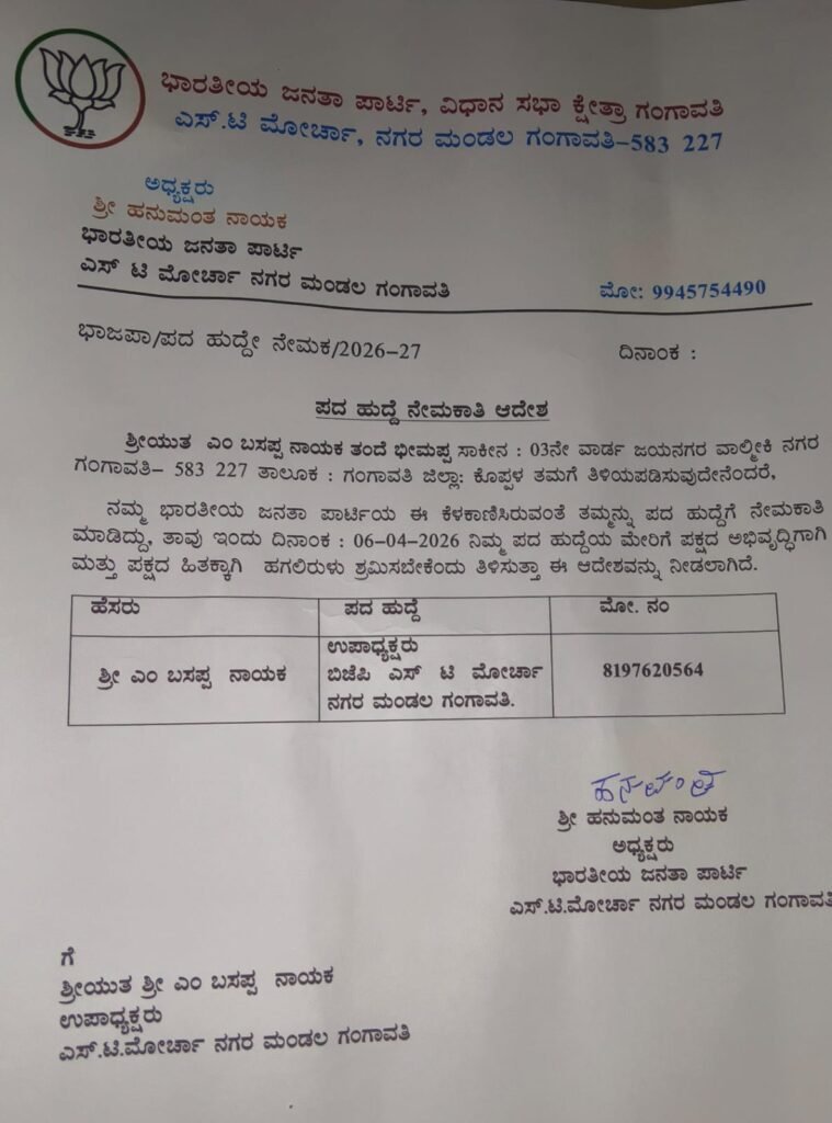 ಗಂಗಾವತಿ, ಏಪ್ರಿಲ್ 6:ಗಂಗಾವತಿ ನಗರದಲ್ಲಿ ಭಾರತೀಯ ಜನತಾ ಪಾರ್ಟಿ (ಬಿಜೆಪಿ) ಸಂಘಟನೆ ಬಲಪಡಿಸುವ ಉದ್ದೇಶದಿಂದ ಎಸ್ಟಿ ಮೋರ್ಚಾ ನಗರ ಮಂಡಲಕ್ಕೆ ಮಹತ್ವದ ನೇಮಕಾತಿ ಮಾಡಲಾಗಿದೆ.03ನೇ ವಾರ್ಡ್ ಜಯನಗರ (ವಾಲ್ಮೀಕಿ ನಗರ) ನಿವಾಸಿ ಶ್ರೀ ಎಂ. ಬಸಪ್ಪ ನಾಯಕ ಅವರನ್ನು ಉಪಾಧ್ಯಕ್ಷರಾಗಿ ನೇಮಕ ಮಾಡಲಾಗಿದೆ. ಈ ಕುರಿತು ಅಧಿಕೃತ ಆದೇಶವನ್ನು ಮಂಡಲ ಅಧ್ಯಕ್ಷರಾದ ಹನುಮಂತ ನಾಯಕ ಅವರು ಹೊರಡಿಸಿದ್ದಾರೆ.