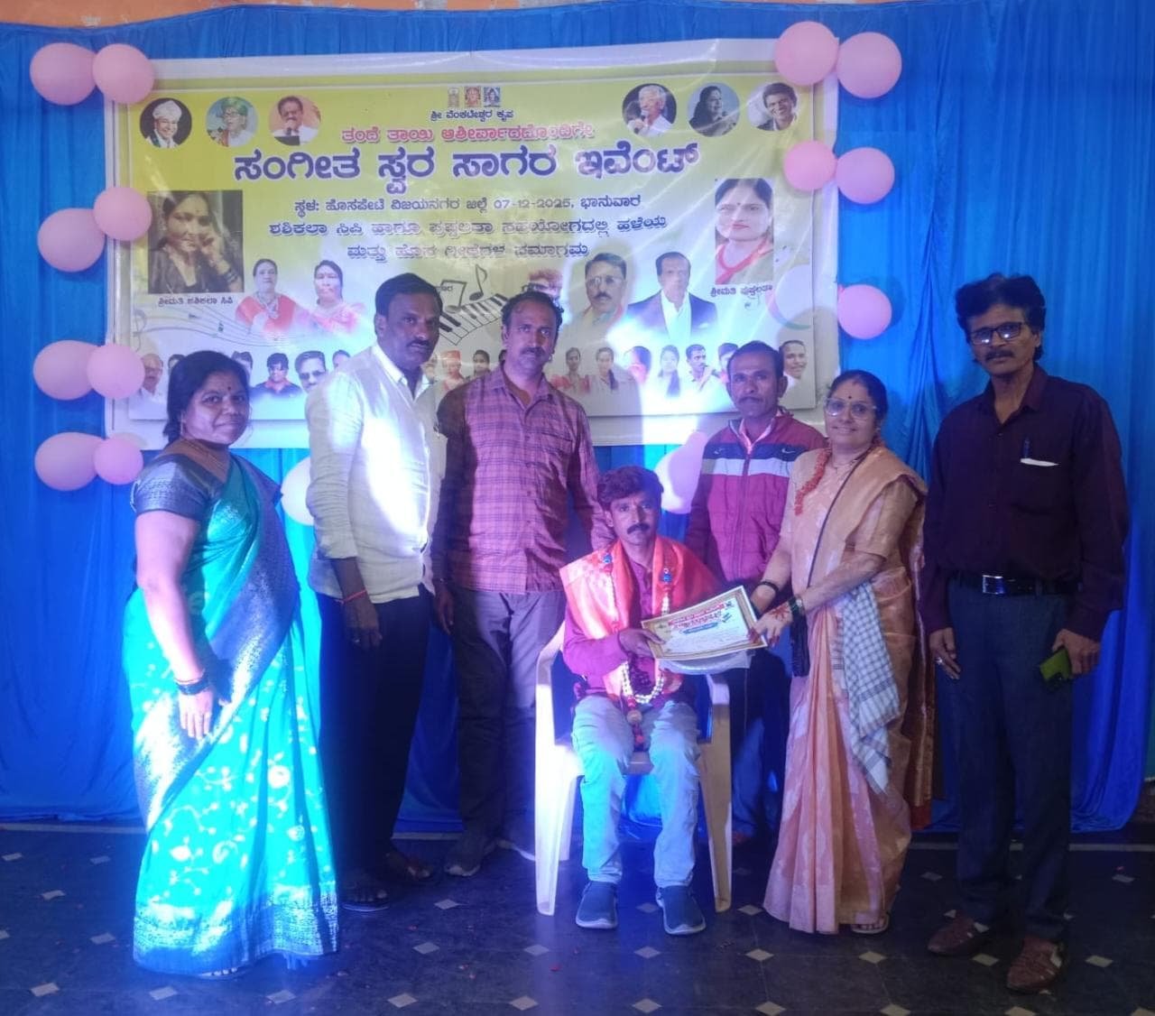 ಹೊಸಪೇಟೆ,08 : ನಗರದ ಸರ್ಕಾರಿ ನೌಕರರ ಭವನದಲ್ಲಿ ಸಂಗೀತ ಸ್ವರ ಸಾಗರ ಇವೆಂಟ್ ನೋಡುಗರ ಮನರಂಜಿಸಿತು. ಸಿ.ಪಿ.ಶಶಿಕಲಾ ಮತು ಪುಷ್ಪಲತಾ ಇವರ ಸಹಯೋಗದಲ್ಲಿ ಹಳೆಯ ಮತ್ತು ಹೊಸ ಕನ್ನಡ ಗೀತೆಗಳ ಗಾಯನ ಸಮಾಗಮ ನಡೆಯಿತು ರಾಜ್ಯದ ಬೆಂಗಳೂರು, ಮಂಗಳೂರು, ಬಾಗಲಕೋಟೆ, ಧಾರವಾಡ, ಬಳ್ಳಾರಿ, ಕೊಪ್ಪಳ, ರಾಯಚೂರು, ಮತ್ತು ಸ್ಥಳೀಯ ವಿಜಯನಗರ ಜಿಲ್ಲೆಯಿಂದ ಗಾಯಕರುಆಗಮಿಸಿ ಕನ್ನಡದ ಡಾ.ರಾಜಕುಮಾರ, ವಿಷ್ಣುವರ್ಧನ, ಅಂಬರೀಶ ಸೇರಿದಂತೆ ಈಗಿನ ಹೊಸ ನಟರ ಹಳೆಯ ಮತ್ತು ಹೊಸ ಗೀತೆಗಳನ್ನು ಹಾಡಿ ನೋಡುಗರ ಮನರಂಜಿಸಿದರು ಗೀತೆಗಳನ್ನು ಹಾಡಿದ ಗಾಯಕರಿಗೆ ಪ್ರೆಸ್ ಕ್ಲಬ್ ನ ಜಿಲ್ಲಾಧ್ಯಕ್ಷ ಪ್ರಕಾಶ್ ಕಾಕುಬಾಳು ಹಾಗು ಸಿ.ಪಿ.ಶಶಿಕಲಾ ಅವರು ಪ್ರಮಾಣಪತ್ರಗಳನ್ನು ವಿತರಿಸಿದರು ಈ ಸಂದರ್ಭದಲ್ಲಿ ನಿರೂಪಣೆ ಕಾರ್ಯಕ್ರಮವನ್ನು ಅಚ್ಚುಕಟ್ಟಾಗಿ ನಿರ್ವಹಿಸಿದ ಕೊಪ್ಪಳ ತಾಲೂಕು ಕುಂಬಾರ ಸಮಾಜದ ಅಧ್ಯಕ್ಷ ಡಾ.ಅಮರೇಶ ಕುಂಬಾರ.ಇಂಧರಗಿ ಇವರಿಗೆ ಸನ್ಮಾನಿಸಿ ಗೌರವಿಸಿದರು ಮತ್ತು ಸಂತೋಷ್ ಕಾರ್ಯಕ್ರಮ ನಿರ್ವಹಿಸಿದರು.