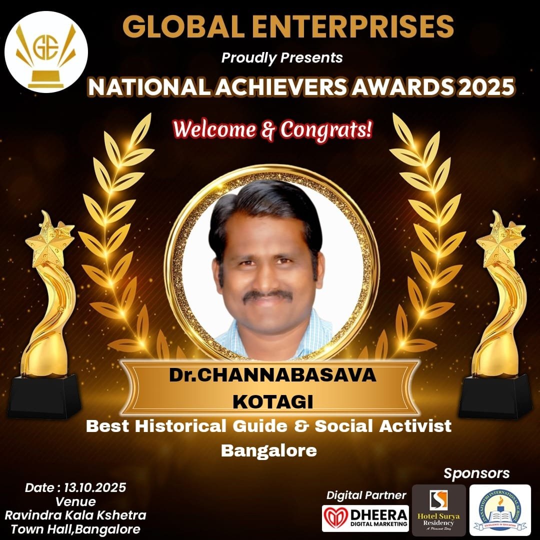 ಗಂಗಾವತಿ: ನಗರದ ನಿವಾಸಿಯಾದ ಚನ್ನಬಸವ ಕೊಟಗಿಯವರು ಒಬ್ಬ ವರದಿಗಾರರಾಗಿ ಮಾಧ್ಯಮ ಕ್ಷೇತ್ರದಲ್ಲಿ ಸುಮಾರು ೧೫ ವರ್ಷಗಳಿಂದ ಸೇವೆ ಸಲ್ಲಿಸಿರುವುದನ್ನು ಗುರುತಿಸಿ ಬೆಂಗಳೂರಿನ ಗ್ಲೋಬಲ್ ಎಂಟರ್ಪ್ರೆöÊಸಸ್ವತಿಯಿAದ ರಾಷ್ಟಿçÃಯ ಸಾಧಕ ಪ್ರಶಸ್ತಿ-೨೦೨೫ ನೀಡಲಾಗುತ್ತಿದೆ ಎಂದು ಸಾರ್ವಜನಿಕ ಸಂಪರ್ಕ ಅಧಿಕಾರಿಯಾದ ಶಾಂತಾ ತಿಳಿಸಿದ್ದಾರೆ. ಚನ್ನಬಸವ ಕೊಟಗಿಯವರು ಒಬ್ಬ ಕಲಾವಿದರಾಗಿ, ಪತ್ರಕರ್ತರಾಗಿ ಸೇವೆ ಸಲ್ಲಿಸುತ್ತಾ, ಐತಿಹಾಸಿಕ ಪ್ರೇಕ್ಷಣಿಯ ಸ್ಥಳಗಳಲ್ಲಿ ಪ್ರವಾಸಿಗರ ಮಾರ್ಗದರ್ಶಕರಾಗಿ, ಸಂಘಟಕರಾಗಿ, ಸಂಘ-ಸAಸ್ಥೆಗಳ ಪ್ರತಿನಿಧಿಯಾಗಿ, ಗಣ್ಯವ್ಯಕ್ತಿಗಳ ಆಪ್ತ ಸಹಾಯಕರಾಗಿ ಹತ್ತಾರು ಸೇವೆಗಳನ್ನು ಸಲ್ಲಿಸುತ್ತಾ, ವಿವಿಧ ಖಾಸಗಿ ಟಿ.ವಿ ಚಾನೆಲ್ಗಳು ಹಾಗೂ ಪತ್ರಿಕೆಗಳಲ್ಲಿ ಕರ್ತವ್ಯನಿರ್ವಹಿಸಿ, ಪ್ರಸ್ತುತ ಭಾರತ ಸರ್ಕಾರದ ದೂರದರ್ಶನ ಚಂದನ ವಾಹಿನಿಯಲ್ಲಿ ಪ್ರೊಡಕ್ಷನ್ ಅಸಿಸ್ಟೆಂಟ್ ಹಾಗೂ ಭಾರತೀಯ ಜೀವ ವಿಮಾ ನಿಗಮದ ಏಜೆಂಟ್ ಆಗಿ ಕರ್ತವ್ಯ ನಿರ್ವಹಿಸುತ್ತಿದ್ದಾರೆ. ಇವರ ಸೇವೆಯನ್ನು ಗುರುತಿಸಿ ಇತ್ತೀಚೆಗೆ ಹರಿಯಾಣ ರಾಜ್ಯದ ಫರಿದಾಬಾದ್ನ ಮ್ಯಾಜಿಕ್ & ಆರ್ಟ್ ವಿಶ್ವವಿದ್ಯಾಲಯ ಗೌರವ ಡಾಕ್ಟರೇಟ್ ನೀಡಿ ಗೌರವಿಸಿದೆ. ಇವರ ಈ ಸಾಧನೆಯನ್ನು ಗುರುತಿಸಿದ ಬೆಂಗಳೂರಿನ ಗ್ಲೋಬಲ್ ಎಂಟರ್ಪ್ರೆöÊಸಸ್ರವರು ಇವರಿಗೆ ಅಕ್ಟೋಬರ್-೧೩ ರಂದು ಬೆಂಗಳೂರಿನ ರವೀಂದ್ರ ಕಲಾಕ್ಷೇತ್ರದ ಟೌನ್ಹಾಲ್ನಲ್ಲಿ ಏರ್ಪಡಿಸಿರುವ ಕಾರ್ಯಕ್ರಮದಲ್ಲಿ ಪ್ರಶಸ್ತಿ ನೀಡಿ ಗೌರವಿಸಲಾಗುವುದು ಎಂದರು.ಇವರಿಗೆ ಕರ್ನಾಟಕ ರಾಜ್ಯದ ಸಮಸ್ತ ನಾಗರಿಕರು, ಕಲಾವಿದರು, ಪತ್ರಕರ್ತರು, ಸಾಹಿತಿಗಳು, ಸಂಘ-ಸoಸ್ಥೆಗಳ ಪದಾಧಿಕಾರಿಗಳು ಅಭಿನಂದನೆಗಳನ್ನು ಸಲ್ಲಿಸಿದ್ದಾರೆ.
