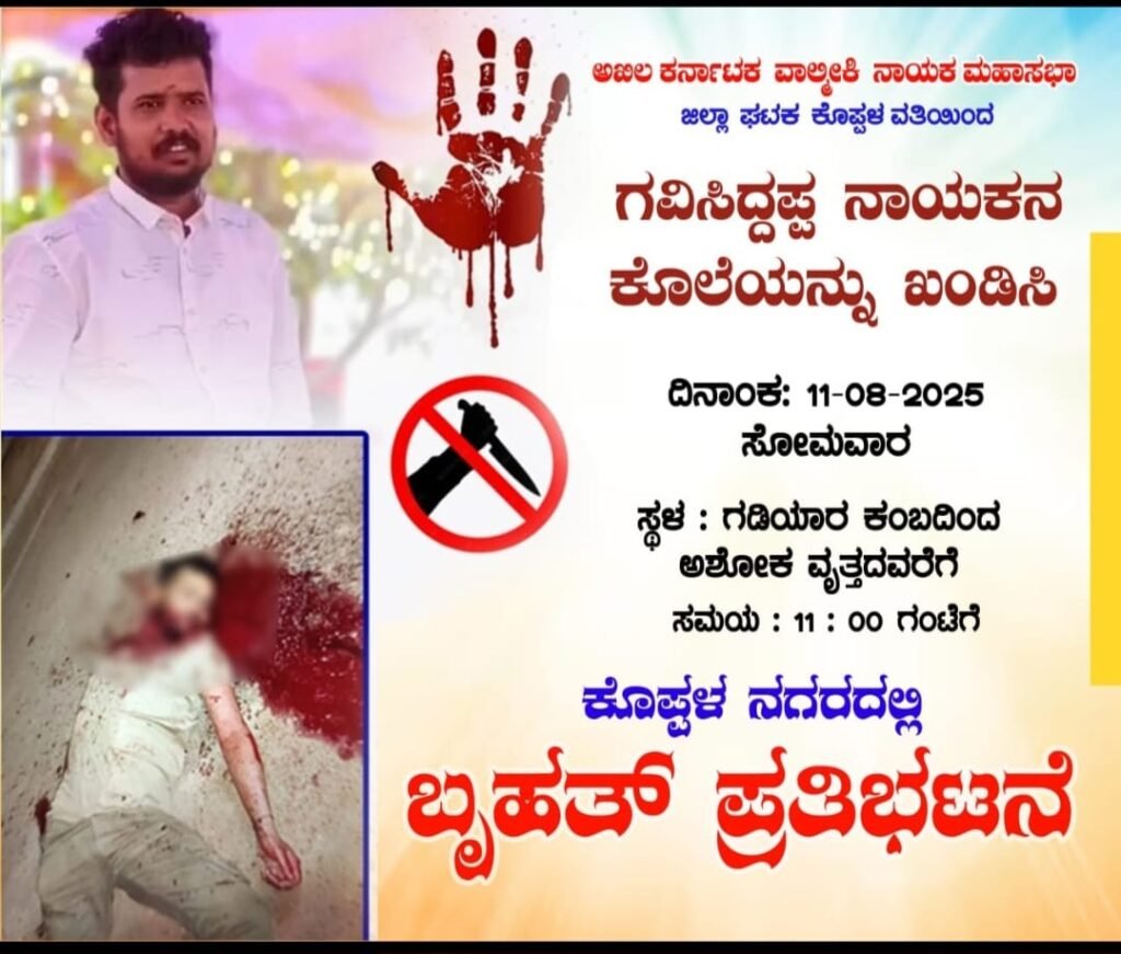 ಕೊಪ್ಪಳ ಜಿಲ್ಲೆ,.. ಕೊಪ್ಪಳ ನಗರದಲ್ಲಿ ನಡೆದ ಗವಿಸಿದ್ದಪ್ಪ ನಾಯಕ್ ಅವರ ಕೊಲೆಯನ್ನು ಖಂಡಿಸಿ ದಿನಾಂಕ 11.08.2025 ಸೋಮವಾರದಂದು ಕೊಪ್ಪಳ ಜಿಲ್ಲಾ ಕೇಂದ್ರದಲ್ಲಿ ಸಮಾಜದ ವತಿಯಿಂದ ಬೃಹತ್ ಪ್ರತಿಭಟನೆ ಹಮ್ಮಿಕೊಂಡಿದ್ದು ಕೊಲೆ ಮಾಡಿದ ಆರೋಪಿಗಳಿಗೆ ಗಲ್ಲು ಶಿಕ್ಷೆ ನೀಡಬೇಕು ಹಾಗೂ ನೊಂದ ಕುಟುಂಬಕ್ಕೆ ಸರ್ಕಾರದ ವತಿಯಿಂದ ಸರ್ಕಾರದ ವತಿಯಿಂದ ಮೂಲಭೂತ ಸೌಕರ್ಯಗಳನ್ನು ನೀಡಬೇಕು ಮತ್ತು ಕುಟುಂಬದ ಮಹಿಳೆಗೆ ಸರ್ಕಾರದ ಉದ್ಯೋಗ ಒದಗಿಸಿ ಕೊಡಬೇಕೆಂದುಕರ್ನಾಟಕ ಮಾನ್ಯ ರಾಜ್ಯಪಾಲರಿಗೆ ಹಾಗೂ ಮಾನ್ಯ ಮುಖ್ಯಮಂತ್ರಿಗಳು ಕರ್ನಾಟಕ ಸರ್ಕಾರ ಸಮಾಜ ಕಲ್ಯಾಣ ಸಚಿವರಿಗೆ ಜಿಲ್ಲಾಧಿಕಾರಿಗಳ ಮುಖಾಂತರ ಮನವಿ ಸಲ್ಲಿಸುವುದರ ಜೊತೆಗೆ ಒತ್ತಾಯಿಸುತಿದ್ದೇವೆ ಈ ಕಾರ್ಯಕ್ರಮದಲ್ಲಿ ಗಂಗಾವತಿ ತಾಲೂಕಿನ ಸಮಸ್ತ ಸಮಾಜದ ಬಂಧುಗಳು ಹಿರಿಯರು ಯುವ ಮುಖಂಡರು ಮಹಿಳೆಯರು ವಿದ್ಯಾರ್ಥಿಗಳು ಅತಿಹೆಚ್ಚಿನ ಸಂಖ್ಯೆಯಲ್ಲಿ ಭಾಗವಹಿಸಿ ಈ ಕಾರ್ಯಕ್ರಮವನ್ನು ಯಶಸ್ವಿ ಗೊಳಿಸಬೇಕೆಂದು ಅಧ್ಯಕ್ಷ ವೀರಭದ್ರಪ್ಪ ನಾಯಕ. ಪ್ರಕಟಣೆಯಲ್ಲಿ ತಿಳಿಸಿದ್ದಾರೆ.