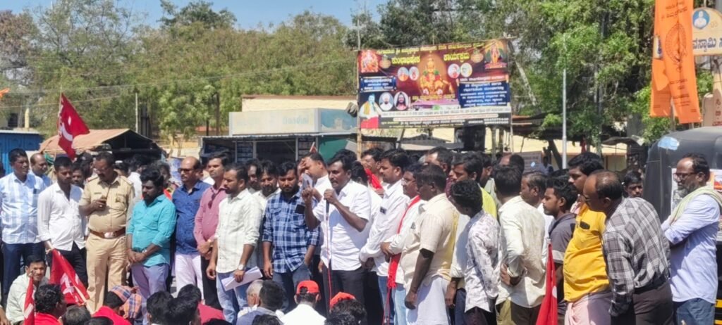 ಕಾರ್ಮಿಕರು-ರೈತರು-ಕೃಷಿ ಕೂಲಿಕಾರರು ಜಂಟಿ ಕಾರ್ಮಿಕರ ಸಂಘಟನೆಗಳು ಸಿಬಿಎಸ್ ಸರ್ಕಲಲ್ಲಿ ಸುಮಾರು ಎರಡು ತಾಸ್ ರಸ್ತಾರೋಕ (ಮಾಡಿ ರಸ್ತೆ ಬಂದ್ ಮಾಡಿ) ಬಂದ್ ಮಾಡುವುದರ ಮೂಲಕ ಹೋರಾಟವನ್ನು ಮಾಡಲಾಯಿತು ಈ ಸಂದರ್ಭದಲ್ಲಿ ಸಿ ಐ ಟಿ ಯು ನ ರಾಜ್ಯ ಕಾರ್ಯದರ್ಶಿಗಳು ನಿರುಪಾದಿ ಬೆಣಕಲ್ ಸಿ ಐ ಟಿ ಯು ನ ಜಿಲ್ಲಾ ಕಾರ್ಯದರ್ಶಿಗಳಾದ ಮಂಜುನಾಥ್ ಡಗ್ಗಿ ಕೃಷಿ ಕೂಲಿಕಾರರ ಸಂಘದ ಜಿಲ್ಲಾ ಉಪಾಧ್ಯಕ್ಷರಾದ ಹುಸೇನಪ್ಪ ಕೆ ಅಂಗನವಾಡಿ ನೌಕರರ ಸಂಘದ ಜಿಲ್ಲಾ ಅಧ್ಯಕ್ಷರಾದ ಗಿರಿಜಮ್ಮ ತಾಲೂಕು ಅಧ್ಯಕ್ಷರಾದ ದುರ್ಗಮ್ಮ ಹೊಸ್ಕೆರ್ ಎಸ್ ಎಫ್ ಐ ತಾಲೂಕು ಅಧ್ಯಕ್ಷರು ನಾಗರಾಜ ಯು ಕಟ್ಟಡ ಕಾರ್ಮಿಕರ ಸಂಘದ ತಾಲೂಕ ಅಧ್ಯಕ್ಷರು ಮುತ್ತಣ್ಣಆಟೋ ಚಾಲಕರು ಲಾರಿ ಚಾಲಕರು ಅಂಗನವಾಡಿ ನೌಕರರು ಬಿಸಿಊಟ ನೌಕರರು ಹಮಾಲಿ ಕಾರ್ಮಿಕರು ಕಟ್ಟಡ ಕಾರ್ಮಿಕ ಮುಖಂಡರುಗಳು ಉಪಸ್ಥಿತಿಯಲ್ಲಿದ್ದರು