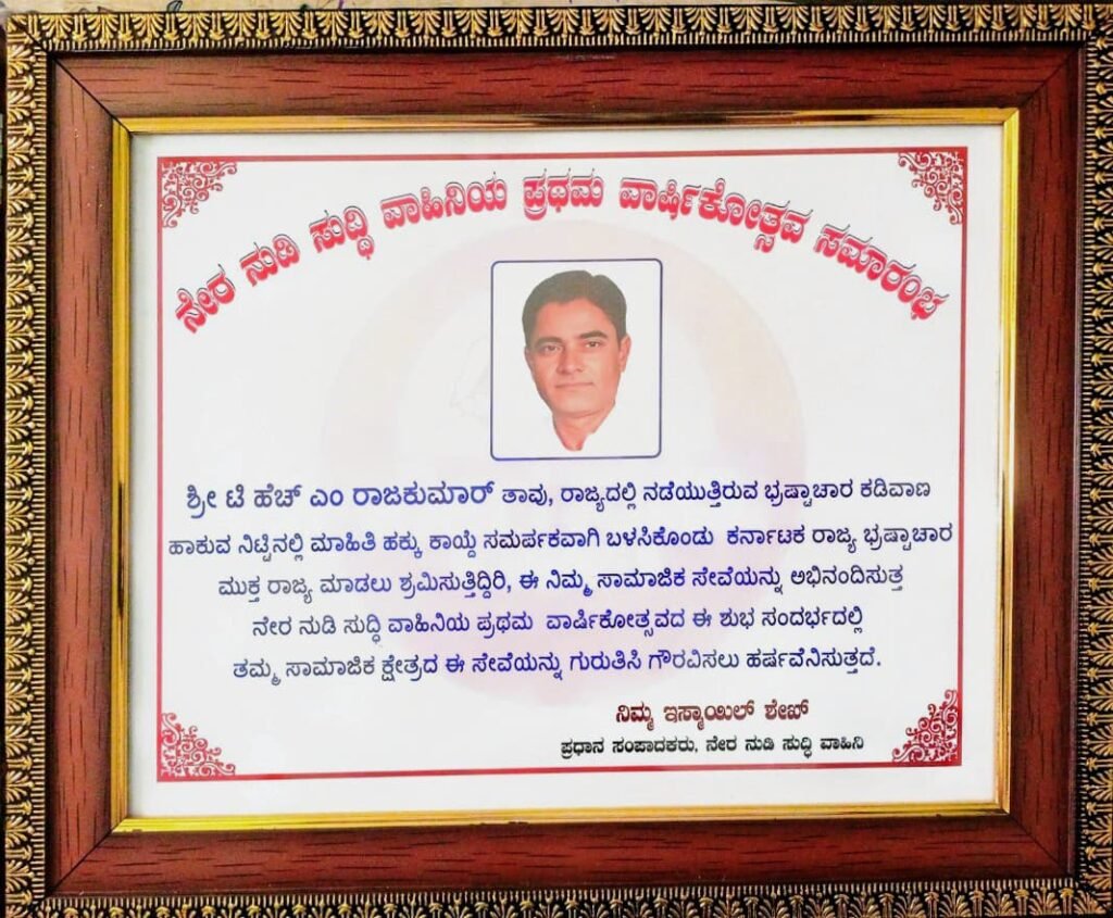 ಸಮಾಜ ಸೇವಾ ಕಾರ್ಯಕರ್ತರ ವೇದಿಕೆಯ ರಾಜ್ಯ ಕಾರ್ಯಧ್ಯಕ್ಷ ಟಿ. ಎಚ್. ಎಂ. ರಾಜಕುಮಾರ್ ರವರಿಗೆ ಸಮಾಜ ಸೇವಾ ಕ್ಷೇತ್ರದಲ್ಲಿ ಅತ್ಯುತ್ತಮ ‘ಸೇವಾ ರತ್ನ ಪ್ರಶಸ್ತಿ’