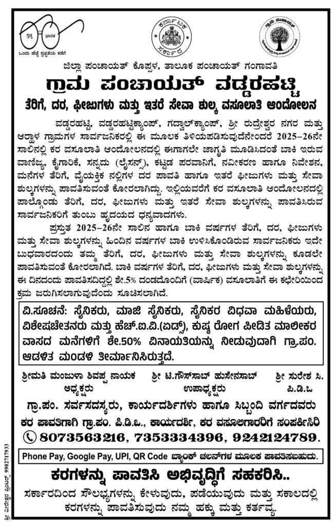 ಗಂಗಾವತಿ : ತಾಲೂಕಿನ ವಡ್ಡರಹಟ್ಟಿ ಗ್ರಾಮ ಪಂಚಾಯತಿ ವ್ಯಾಪ್ತಿಯಲ್ಲಿ 2025-26ನೇಸಾಲಿನಲ್ಲಿ ಕರ ವಸೂಲಾತಿ ಆಂದೋಲನ ಆರಂಭಿಸಿದ್ದು, ಬಾಕಿ ಉಳಿಸಿಕೊಂಡಿರುವ ಎಲ್ಲಾ ಸಾರ್ವಜನಿಕ ಮಳಿಗೆಗಳು, ರೈಸ್ ಮಿಲ್ ಗಳು, ನಿವೇಶನ ಮತ್ತು ನೀರಿನ ತೆರಿಗೆ ಪಾವತಿಸುಂತೆ ವಡ್ಡರಹಟ್ಟಿ ಗ್ರಾಪಂ ಅಭಿವೃದ್ಧಿ ಅಧಿಕಾರಿಗಳಾದ ಸುರೇಶ ಚಲವಾದಿ ಅವರು ಸೂಚಿಸಿದ್ದಾರೆ.ಈಗಾಗಲೇ ಮನೆ – ಮನೆ ಭೇಟಿ ನೀಡಿ ಗ್ರಾಮಸ್ಥರಿಗೆ ಕರ ವಸೂಲಾತಿ ಆಂದೋಲನ ಜಾಗೃತಿ ಮೂಡಿಸಲಾಗಿದೆ. ವಡ್ಡರಹಟ್ಟಿ ಗ್ರಾಮ ಪಂಚಾಯತ್ ಗಳ ವ್ಯಾಪ್ತಿಯಲ್ಲಿ ಬರುವ ಎಲ್ಲಾ ಸಾರ್ವಜನಿಕ ಮಳಿಗೆಗಳು, ರೈಸ್ ಮಿಲ್ ಗಳು, ಪೆಟ್ರೋಲ್ ಬಂಕ್ ಗಳು, ಖಾಸಗಿ ಶಾಲೆ-ಕಾಲೇಜುಗಳು, ವಾಣಿಜ್ಯ ಆಸ್ತಿಗಳ ತೆರಿಗೆ ಸೇರಿದಂತೆ ಇತರೆ ಎಲ್ಲಾ ಸಣ್ಣ/ದೊಡ್ಡ ವ್ಯಾಪಾರಿಗಳು ಗ್ರಾಮ ಪಂಚಾಯತ್ ಸಿಬ್ಬಂದಿಗಳಿಗೆ ಸಹಕಾರ ನೀಡಿ ಪರವಾನಗಿ ನವೀಕರಿಸಿಕೊಳ್ಳಬೇಕು.ಈಗಾಗಲೇ ತೆರಿಗೆ, ದರ, ಪೀಜುಗಳು ಮತ್ತು ಇತರೆ ಸೇವಾ ಶುಲ್ಕಗಳನ್ನು ಪಾವತಿಸಿರುವ ಸಾರ್ವಜನಿಕರಿಗೆ ತುಂಬು ಹೃದಯದ ಧನ್ಯವಾದಗಳು. ಪ್ರಸ್ತುತ 2025-26ನೇ ಸಾಲಿನ ಹಾಗೂ ಬಾಕಿ ವರ್ಷಗಳ ತೆರಿಗೆ, ದರ, ಫೀಜುಗಳುಮತ್ತು ಸೇವಾ ಶುಲ್ಕಗಳನ್ನು ಹಿಂದಿನ ವರ್ಷಗಳ ಬಾಕಿ ಉಳಿಸಿಕೊಂಡಿರುವ ಸಾರ್ವಜನಿಕರು ಇದೇ ಡಿ.17ರಂದು (ಬುಧವಾರ) ತಮ್ಮ ತೆರಿಗೆ ದರ, ಫೀಜುಗಳು ಮತ್ತು ಸೇವಾ ಶುಲ್ಕಗಳನ್ನು ಕೂಡಲೇ ಪಾವತಿಸುವಂತೆ ಕೋರಲಾಗಿದೆ. ಬಾಕಿ ವರ್ಷಗಳ ತೆರಿಗೆ, ದರ, ಫೀಜುಗಳು ಮತ್ತು ಸೇವಾ ಶುಲ್ಕಗಳನ್ನುಈ ದಿನದಂದು ಪಾವತಿಸದಿದ್ದಲ್ಲಿ ಶೇ.5% ದಂಡದೊಂದಿಗೆ (ವಾರ್ಷಿಕ) ವಸೂಲಾತಿಗೆ ಈ ಕಛೇರಿಯಿಂದ ಕ್ರಮ ಜರುಗಿಸಲಾಗುವುದು. ಗ್ರಾಮ ಪಂಚಾಯತ್ ವ್ಯಾಪ್ತಿಯ ಸೈನಿಕರು, ಮಾಜಿ ಸೈನಿಕರು, ಸೈನಿಕರ ವಿಧವಾ ಮಹಿಳೆಯರು, ವಿಶೇಷ ಚೇತನರು ಮತ್ತು ಹೆಚ್.ಐ.ವಿ. (ಏಡ್ಸ್), ಕುಷ್ಠರೋಗ ಪೀಡಿತ ಮಾಲೀಕರ ವಾಸದ ಮನೆಗಳಿಗೆ ಶೇ.50% ವಿನಾಯತಿ ನೀಡುವುದಾಗಿ ಗ್ರಾ.ಪಂ.ಆಡಳಿತ ಮಂಡಳಿ ಶೀರ್ಮಾನಿಸಿರುತ್ತದೆ ಎಂದು ಪ್ರಕಟಣೆಯಲ್ಲಿ ಗ್ರಾಪಂ ಅಧ್ಯಕ್ಷರಾದ ಮಂಜುಳಾ ಶಿವಪ್ಪ ನಾಯಕ, ಉಪಾಧ್ಯಕ್ಷರಾದ ಟಿ.ಗೌಸ್ಸಾಬ್ ಹುಸೇನಸಾಬ್, ಪಿಡಿಓ ಸುರೇಶ ಸಿ., ಗ್ರಾಪಂ ಸದಸ್ಯರು ತಿಳಿಸಿದ್ದಾರೆ. ಗ್ರಾಪಂ ವ್ಯಾಪ್ತಿಯ ಮಾಲೀಕರು ಕರ ಪಾವತಿಗೆ ಗ್ರಾಪಂ ಪಿಡಿಓ, ಕಾರ್ಯದರ್ಶಿಗಳು, ಕರವಸೂಲಿಗಾರರ ಮೊಬೈಲ್ ನಂಬರ್ 8073563216, 7353334396, 9242124789 ಸಂಖ್ಯೆಗೆ ಸಂಪರ್ಕಿಸಿ ಕರಗಳನ್ನು ಪಾವತಿಸಿ ಅಭಿವೃದ್ಧಿಗೆ ಸಹಕರಿಸಲು ಕೋರಿದೆ.
