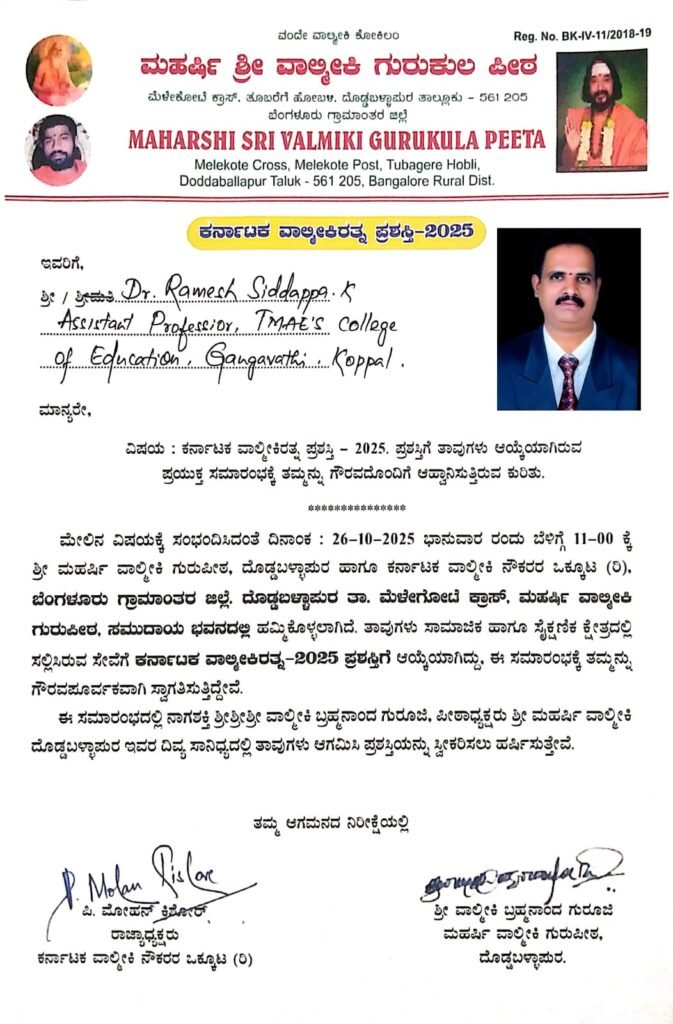 ಗಂಗಾವತಿ:18 ಕರ್ನಾಟಕ ವಾಲ್ಮೀಕಿ ರತ್ನ ಪ್ರಶಸ್ತಿ – 2025. ಪ್ರಶಸ್ತಿಗೆ ಕೆ.ರಮೇಶ್ ಸಿದ್ದಪ್ಪ ಆಯ್ಕೆಯಾಗಿದ್ದಾರೆ. ದಿನಾಂಕ 26-10-2025 ಭಾನುವಾರ ರಂದು ಬೆಳಿಗ್ಗೆ 11-00 ಕ್ಕೆ ಶ್ರೀ ಮಹರ್ಷಿ ವಾಲ್ಮೀಕಿ ಗುರುಪೀಠ, ದೊಡ್ಡಬಳ್ಳಾಪುರ ಹಾಗೂ ಕರ್ನಾಟಕ ವಾಲ್ಮೀಕಿ ನೌಕರರ ಒಕ್ಕೂಟ (ರಿ), ಬೆಂಗಳೂರು ಗ್ರಾಮಾಂತರ ಜಿಲ್ಲೆ. ದೊಡ್ಡಬಳ್ಳಾಪುರ ತಾ. ಮೆಳೇಗೋಟೆ ಕ್ರಾಸ್, ಮಹರ್ಷಿ ವಾಲ್ಮೀಕಿ ಗುರುಪೀಠ, ಸಮುದಾಯ ಭವನದಲ್ಲಿ ಹಮ್ಮಿಕೊಳ್ಳಲಾಗಿದೆ. ಸಾಮಾಜಿಕ ಹಾಗೂ ಶೈಕ್ಷಣಿಕ ಕ್ಷೇತ್ರದಲ್ಲಿ ಸಲ್ಲಿಸಿರುವ ಸೇವೆಗೆ ಕರ್ನಾಟಕ ವಾಲ್ಮೀಕಿರತ್ನ-2025 ಪ್ರಶಸ್ತಿಗೆ ಆಯ್ಕೆಯಾಗಿದ್ದು,ಈ ಸಮಾರಂಭದಲ್ಲಿ ನಾಗಶಕ್ತಿ ಶ್ರೀಶ್ರೀಶ್ರೀ ವಾಲ್ಮೀಕಿ ಬ್ರಹ್ಮನಾಂದ ಗುರೂಜಿ, ಪೀಠಾಧ್ಯಕ್ಷರು ಶ್ರೀ ಮಹರ್ಷಿ ವಾಲ್ಮೀಕಿ ದೊಡ್ಡಬಳ್ಳಾಪುರ ಇವರ ದಿವ್ಯ ಸಾನಿಧ್ಯದಲ್ಲಿ ಪ್ರಶಸ್ತಿಯನ್ನು ನೀಡಲಾಗುತ್ತದೆ ಎಂದು ತಿಳಿಸಿದ್ದಾರೆ. ರಮೇಶ್ ಅವರಿಗೆ ಸಿಕ್ಕ ಈ ಪ್ರಶಸ್ತಿ ಗೌರವಕ್ಕೆ ಸ್ಥಳೀಯ ಅಭಿಮಾನಿಗಳು, ಸಂಘ ಸಂಸ್ಥೆಯ ಮುಖಂಡರು ಅಭಿನಂದಿಸಿದ್ದಾರೆ.