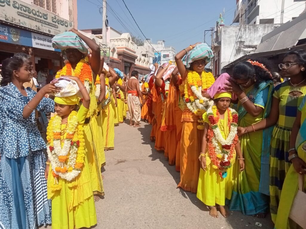ಗಂಗಾವತಿ. 20-01-2026, ಮಂಗಳವಾರ, ನಮ್ಮ ಆರ್ಯವೈಶ್ಯ ಕುಲದೇವಿ ಶ್ರೀ ಕನ್ನಿಕಾ ಪರಮೇಶ್ವರಿ ಅಮ್ಮನವರ ಆತ್ಮಾರ್ಪಣೆ ದಿನದ ಪಾವನ ಸಂದರ್ಭದಲ್ಲಿ, 50ಕ್ಕೂ ಹೆಚ್ಚು ವಾಸವಿ ಮಾಲಾಧಾರಿಗಳು ಶ್ರೀ ನಗರೇಶ್ವರ ದೇವಸ್ಥಾನದಲ್ಲಿ ವಿಶೇಷ ಪೂಜೆ ಸಲ್ಲಿಸಿದರು. ನಂತರ ಇರುಮುಡಿ ಕಟ್ಟಿ ಮೆರವಣಿಗೆಯ ಮೂಲಕ ಹಿರೇ ಜಂತಕಲ್ನ ಶ್ರೀ ವಾಸವಿ ವೈಭವದ ಮೆರವಣಿಗೆಯಲ್ಲಿ ಸಮಸ್ತ ಆರ್ಯವೈಶ್ಯ ಸಮಾಜವು ಭಕ್ತಿಭಾವದಿಂದ ಭಾಗವಹಿಸಿತು.ಈ ಸಂದರ್ಭದಲ್ಲಿ ಕರ್ನಾಟಕದ ಪ್ರಥಮ ಮಹಿಳಾ ಅಧ್ಯಕ್ಷರಾದ ರೂಪಾರಾಣಿ ಲಕ್ಷ್ಮಣ್ (ರಾಯಚೂರು) ಅವರು ವಾಸವಿ ಮಾಲೆ ಧರಿಸಿ, ಮೂರು ದಿನಗಳ ಮೌನ ವ್ರತದೊಂದಿಗೆ ವಾಸವಿ ದೇವಸ್ಥಾನ ನಿರ್ಮಾಣ ಕಾರ್ಯ ಶೀಘ್ರ ಪೂರ್ಣಗೊಳ್ಳಲಿ ಎಂದು ಸಂಕಲ್ಪ ಕೈಗೊಂಡಿದ್ದು ವಿಶೇಷವಾಗಿತ್ತು. ಇದೇ ಸಂದರ್ಭದಲ್ಲಿ ಶ್ರೀ ಕನ್ನಿಕಾ ಪರಮೇಶ್ವರಿ ದೇವಸ್ಥಾನದಲ್ಲಿ ವಿವಿಧ ಧಾರ್ಮಿಕ ಕಾರ್ಯಕ್ರಮಗಳು ನಡೆಸಲಾಯಿತು.