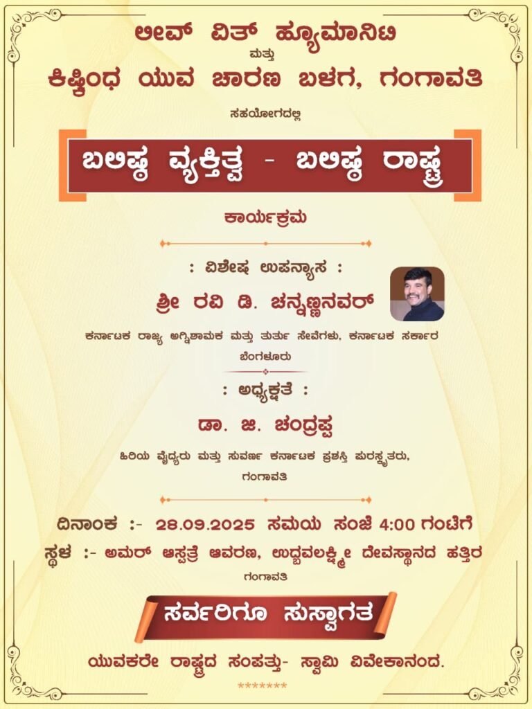 ಗಂಗಾವತಿ ನಗರದ ಲೀವ್ ವಿತ್ ಹ್ಯೂಮಾನಿಟಿ ಹಾಗೂ ಕಿಷ್ಕಿಂಧ ಯುವ ಜಾರಣ ಬಳಗ ಸಮಿತಿಯವರು ಸಹಯೋಗದಲ್ಲಿ ಏರ್ಪಡಿಸಿರುವ ವಿದ್ಯಾರ್ಥಿ ಪ್ರೇರಣಾ ಶಿಬಿರದಲ್ಲಿ ಪಾಲ್ಗೊಂಡು ವಿದ್ಯಾರ್ಥಿಗಳಿಗೆ ಸ್ಫೂರ್ತಿದಾಯಕ ಮಾತುಗಳನ್ನಾಡಲಿದ್ದಾರೆ. ಇದರೊಂದಿಗೆ ವಿದ್ಯಾರ್ಥಿಗಳ ವಿಕಸನ ಬಗ್ಗೆಯೂ ವಿಶೇಷ ಉಪನ್ಯಾಸ ನೀಡಲಿರುವ ರವಿ ಡಿ. ಚನ್ನಣ್ಣನವರ್ ಅವರ ಆಗಮನಕ್ಕೆ ಗಂಗಾವತಿ ಪಟ್ಟಣದ ಜನತೆ ಮತ್ತು ಗ್ರಾಮೀಣ ವಿದ್ಯಾರ್ಥಿಗಳು ಬಹಳಷ್ಟು ಕಾತುರತೆಯಿಂದ ಕಾಯುತ್ತಿದ್ದಾರೆ.ಅಮರ್ ಆಸ್ಪತ್ರೆ ಆವರಣ ಉದ್ದವಲಕ್ಷ್ಮೀ ದೇವಸ್ಥಾನದ ಹತ್ತಿರ ಭಾನುವಾರ ಸೆ.28ರ ಸಂಜೆ 4.00 ಗಂಟೆಗೆ ನಿಗದಿಯಾಗಿರುವ ಈ ಕಾರ್ಯಕ್ರಮದ ಅಧ್ಯಕ್ಷತೆ ಹಿರಿಯ ವೈದ್ಯರಾದ ಡಾ.ಜಿ.ಚಂದ್ರಪ್ಪ ವಹಿಸಲಿದ್ದಾರೆ. ಹಾಗೂ ಡಾ.ಅಮರೇಶ ಪಾಟೀಲ್,ಅಭಿಷೇಕ ಡಿ.ಎಂ. ಲೀವ್ ವಿತ್ ಹ್ಯೂಮಾನಿಟಿ,ಮತ್ತು ಕಿಷ್ಕಿಂಧ ಯುವ ಜಾರಣ ಬಳಗದವರು ಉಪಸ್ಥಿತರಿರಲಿದ್ದು, ಪಾಲ್ಗೊಳ್ಳಲಿದ್ದಾರೆ ಎಂದು ಪ್ರಕಟಣೆ ತಿಳಿಸಿದೆ.