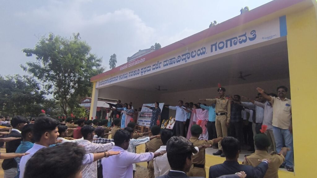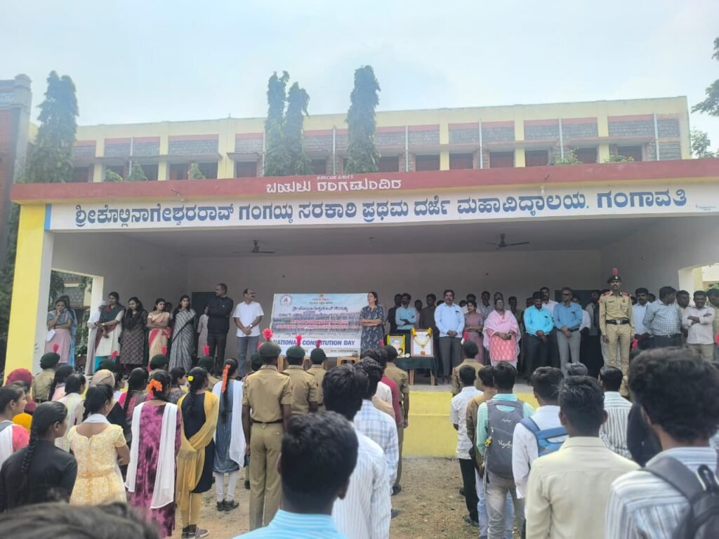 ಗಂಗಾವತಿ. ನಗರದ ಶ್ರೀ ಕೊಲ್ಲಿ ನಾಗೇಶ್ವರರಾವ್ ಗಂಗಯ್ಯ ಪ್ರಥಮ ದರ್ಜೆ ಕಾಲೇಜು ಆವರಣದ ಬಯಲು ರಂಗ ಮಂದಿರ ದಲ್ಲಿ ಇಂದು ವಿದ್ಯಾರ್ಥಿಗಳಿಗೆ ಸಂವಿಧಾನ ದಿನಾಚರಣೆ ಅಂಗವಾಗಿ ವಿದ್ಯಾರ್ಥಿಗಳಿಗೆ ಸಂವಿಧಾನ ಪೀಠಿಕೆಯನ್ನು ಓದುವ ಮುಖಾಂತರ ಕಾರ್ಯಕ್ರಮ ಆಯೋಜನ ಮಾಡಲಾಗಿತ್ತು ಡಾಕ್ಟರ್ ಬಿ ಆರ್ ಅಂಬೇಡ್ಕರ್ ಅವರು ಜಗತ್ತಿನ ಎಲ್ಲಾ ಸಂವಿಧಾನಗಳ ಮಾದರಿಗಳನ್ನು ಓದಿಕೊಂಡು ನಮ್ಮ ಸಂವಿಧಾನವನ್ನು ಅತ್ಯುತ್ತಮವಾಗಿ ರಚಿಸಿದ್ದಾರೆ ಭಾರತದ ಸಂವಿಧಾನ ದೇಶದ ಧರ್ಮ ಗ್ರಂಥ ವಿದ್ದಂತೆ ಸವಿಧಾನ ನಮ್ಮ ಆತ್ಮವಿದ್ದಂತೆಯೆಂದು ಈ ಸಂದರ್ಭದಲ್ಲಿ ಕಾಲೇಜನ ಪ್ರಾಚಾರ್ಯರಾದ ಡಾಕ್ಟರ್ ಶಿವರಾಜ್ ಗುರಿಕಾರ್ ಹೇಳಿದರು ಇದೇ ಸಂದರ್ಭದಲ್ಲಿ ರಾಜ್ಯಶಾಸ್ತ್ರದ ಉಪನ್ಯಾಸಕರ ಮಂಜುನಾಥ್ ಬಳ್ಳಾಪುರ ಸಂವಿಧಾನವನ್ನು ಸರಿಯಾದ ರೀತಿಯಲ್ಲಿ ಓದುವ ಮೂಲಕ ವಿದ್ಯಾರ್ಥಿಗಳು ಎಲ್ಲಾ ಸ್ವಾತಂತ್ರ್ಯವನ್ನು ಮತ್ತು ಪ್ರಸ್ತಾವನೆಯಲ್ಲಿ ಎಲ್ಲವನ್ನು ಅಡಗಿದೆ ಎಂದು ತಿಳಿಸಿದರು ಮತ್ತು ರಾಜ್ಯಶಾಸ್ತ್ರದ ವಿಭಾಗದ ವಿದ್ಯಾರ್ಥಿಗಳಿಂದ ಎಲ್ಲ ವಿದ್ಯಾರ್ಥಿಗಳಿಗೆ ಸಂವಿಧಾನದ ಪೀಠಿಕೆಯನ್ನು ಬೋಧಿಸಿದರು ವಿದ್ಯಾರ್ಥಿಗಳಿಗೆ ದೈಹಿಕ ನಿರ್ದೇಶಕರಾದ ಶೋಭಾ ಪೂಜಾ ಕಾರ್ಯಕ್ರಮ ನೆರವೇರಿಸಿದರು ಈ ಸಂದರ್ಭದಲ್ಲಿ ಅಧ್ಯಾಪಕರಾದ ಜೆ ಕೃಷ್ಣ ಚನ್ನಬಸಪ್ಪ ಚಿಲ್ಕರಾಗಿ ಅಣ್ಣೂಜಿ ರೆಡ್ಡಿ ಮಾರುತಿ ಅಕ್ಕಿ ಮುಮ್ತಾಜ್ ಬೇಗ ಇಬ್ರಾಹಿಂ ಸಾಬ ಪಂಚಾಕ್ಷರಯ್ಯ ಶಿವಕುಮಾರ್ ಉಪಾಸಿ ಮತ್ತು ಕಾಲೇಜಿನ ವಿದ್ಯಾರ್ಥಿಗಳು ಭಾಗವಹಿಸಿದ.