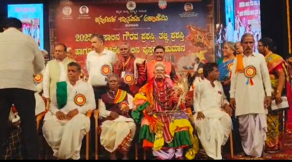 ಗಂಗಾವತಿ : ಜಾನಪದ ಅಕಾಡೆಮಿಯ 2025ನೇ ಸಾಲಿನ ವಾರ್ಷಿಕ ಗೌರವ ಪ್ರಶಸ್ತಿಯನ್ನು ಕಾರಟಗಿ ತಾಲೂಕಿನ ಸಿದ್ದಾಪುರ ಗ್ರಾಮದ ಹಿರಿಯ ಹಗಲು ವೇಷ ಸಾಧಕ ಕಲಾವಿದ ರಾಮಣ್ಣ ಅವರಿಗೆ ಪ್ರದಾನ ಮಾಡಲಾಯಿತು.