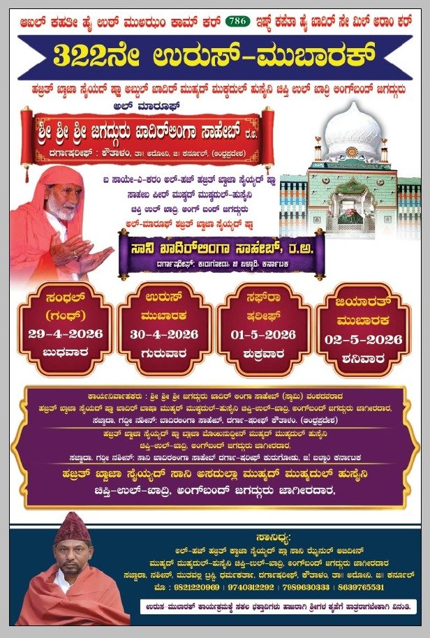 ಶ್ರೀ ಶ್ರೀ ಶ್ರೀ ಜಗದ್ಗುರು ಖಾದಿರ್‌ಲಿಂಗಾ ಸಾಹೇಬ್ 322ನೇ ಉರುಸ್–ಮುಬಾರಕ್: ಭಕ್ತರಿಗೆ ಆಧ್ಯಾತ್ಮಿಕ ಶ್ರೇಯಸ್ಸಿನ ಸುವರ್ಣಾವಕಾಶ – ಹಿರಿಯ ವಕೀಲ ಶರತ್ ದಂಡಿನ್ಕೌತಾಳಂ (ಆಂಧ್ರಪ್ರದೇಶ)