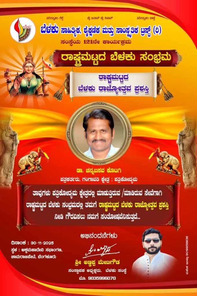 ಡಿಸೆಂಬರ್ 30ರಂದು ಬೆಳಗ್ಗೆ 10 ರಿಂದ ರಾತ್ರಿವರೆಗೂ ಬೆಂಗಳೂರಿನ ಕನ್ನಡ ಸಾಹಿತ್ಯ ಪರಿಷತ್ ಅಕ್ಕಮಹಾದೇವಿ ಸಭಾಂಗಣದಲ್ಲಿ ಭಾನುವಾರ ರಂದು ಚಾಮರಾಜಪೇಟೆ ನಡೆಯಲಿದೆ .ಪತ್ರಿಕೋದ್ಯಮ ರಂಗಭೂಮಿ ಐತಿಹಾಸಿಕ ಮಾರ್ಗದರ್ಶಕ ಸಂಘ ಸಂಸ್ಥೆಗಳ ಪ್ರತಿನಿಧಿ ಕನ್ನಡಪರ ಶರಣರ ಸೇವೆ ಸಂಘಟನೆಗಾಗಿ ವರ್ಷದ ಬೆಳಕು ರಾಜ್ಯೋತ್ಸವ ಪ್ರಶಸ್ತಿ 2025.ರ ಪ್ರಶಸ್ತಿ ನೀಡಿ ಆಯ್ಕೆ ಮಾಡಲಾಗಿದೆ. ಬೆಳಕು ಸಾಹಿತ್ಯ ಶೈಕ್ಷಣಿಕ ಮತ್ತು ಸಂಸ್ಕೃತಿಕ ಟ್ರಸ್ಟ್ (ರಿ). ವಾರ್ಷಿಕೋತ್ಸವ ಸಂದರ್ಭದಲ್ಲಿ ಆಯ್ಕೆ ಮಾಡಲಾಗಿದೆ.ಬೆಳಕು ಸಂಸ್ಥೆಯ ಸಂಸ್ಥಾಪಕರಾದ ಶ್ರೀ ಅಣ್ಣಪ್ಪ ಮೇಟಿ ಗೌಡ ಆದೇಶ ಮಾಡಿದ್ದಾರೆ. ಸುಮಾರು ವರ್ಷಗಳ ಕಾಲ ವರದಿಗಾರ ರಂಗಭೂಮಿ ಸಿನಿಮಾ ಐತಿಹಾಸಿಕ ಮಾರ್ಗದರ್ಶಕ ಗಣ್ಯ ವ್ಯಕ್ತಿಗಳ ಆಪ್ತ ಸಹಾಯಕ ಸಮಾಜ ಸೇವೆ ಸಾಂಸ್ಕೃತಿಕ ಕ್ಷೇತ್ರ ಸೇರಿದಂತೆ ವಿವಿಧ ಕ್ಷೇತ್ರಗಳಲ್ಲಿ ಕಾರ್ಯನಿರ್ವಹಿಸಿ ಅನೇಕ ಪ್ರಶಸ್ತಿಗಳನ್ನು ಪಡೆದ ಶ್ರೀ ಡಾ. ಚನ್ನಬಸವ ಕೊಟಗಿ ಮತ್ತೊಂದು ಪ್ರಶಸ್ತಿಯ ಲಭಿಸಿದೆ.