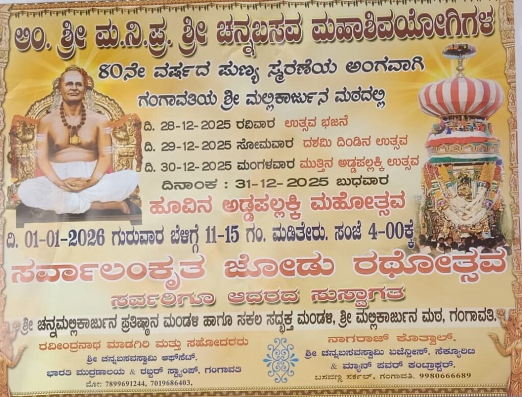 ಗಂಗಾವತಿ.. ಗಂಗಾವತಿಯ ಆರಾಧ್ಯ ದೈವ ಕಾಯಕಯೋಗಿ ತ್ರಿಕಾಲ ಜ್ಞಾನಿಗಳು ತ್ರಿವಿಧ ದಾಸೋಹ ಮೂರ್ತಿಗಳಾದ ಶ್ರೀ ಚನ್ನಬಸವ ಶಿವಯೋಗಿಗಳವರ 80ನೇ ಮಹಾರಥೋತ್ಸವ ಹೊಸ ವರ್ಷದ ಶುಭದಿನವಾದ ಜನವರಿ 1. 2026 ಗುರುವಾರ ದಿನದಂದು ಶ್ರೀ ಚನ್ನಬಸವ ಸ್ವಾಮಿಗಳು ಸೇರಿದಂತೆ ಶ್ರೀಶೈಲ ಮಲ್ಲಿಕಾರ್ಜುನ ಜೋಡು ಮಹಾ ರಥೋತ್ಸವ ಸಂಜೆ ನಾಲ್ಕು ಗಂಟೆಗೆ ಸಕಲ ವಾದ್ಯ ವೈಭವದೊಂದಿಗೆ ಜರುಗಲಿದೆ ಎಂದು.. ಮಲ್ಲಿಕಾರ್ಜುನ ಟ್ರಸ್ಟ್ ಕಮಿಟಿಯ ಹಿರಿಯರಾದ ಶ್ರೀ ಚನ್ನಬಸಯ್ಯ ಸ್ವಾಮಿ. ಮಾಜಿ ಶಾಸಕ ಪರಣ್ಣ ಮುನವಳ್ಳಿ. ನಾಗರಾಜ್ ಬಿ. ಸೂಗೂರಪ್ಪ ಮಹಾಲಿಂಗಪ್ಪ ರಾಚಯ್ಯ ಸ್ವಾಮಿ ಸಿದ್ದಾಪುರ್ ಮಹಾಂತೇಶ್ ಬಿ ನಾಗೇಂದ್ರ ಅಯ್ಯನಗೌಡ ಲಿಂಗರಾಜ ಸೇರಿದಂತೆ ಇತರರು ತಿಳಿಸಿದರು ಅವರು ಮಂಗಳವಾರದಂದು ಶ್ರೀಮಠದ ಪುರಾಣ ಮಂಟಪದಲ್ಲಿ ಸುದ್ದಿಗೋಷ್ಠಿ ನಡೆಸಿ ಮಾತನಾಡಿ ದಿನ ಒಂದು ಗುರುವಾರದಂದು ಕರ್ತೃ ಗದ್ದಿಗೆ ಹಾಗೂ ಶ್ರೀ ಮಲ್ಲಿಕಾರ್ಜುನ ಲಿಂಗಕ್ಕೆ ಮಹಾರುದ್ರಾಭಿಷೇಕ ಬಿಲ್ವಾರ್ಚನೆ ಮಹಾಮಂಗಳಾರತಿ ಸೇರಿದಂತೆ ವಿವಿಧ ಭಾಗಗಳಿಂದ ಆಗಮಿಸಿದ ಸಹಸ್ರಾರು ಭಕ್ತಾದಿಗಳಿಂದ ದೀರ್ಘ ದಂಡ ನಮಸ್ಕಾರ ಗಂಗೆ ಸ್ಥಳ ಪುನಃ ಪುರಾಣ ಆರಂಭ ತೀರಿನ ಪೂಜಾ ಪಟ ಎರಿಸುವುದು ಮಡಿ ರಥೋತ್ಸವ ಸೇರಿದಂತೆ ಮಹಾಪ್ರಸಾದವನ್ನು ಬೆಳಿಗ್ಗೆಯಿಂದ ತಡ ರಾತ್ರಿಯವರಿಗೆ ಜರುಗಲಿದ್ದು ಸಕಲ ಭಕ್ತಾದಿಗಳು ಭಾಗವಹಿಸಿ ಗುರುಗಳ ಹಾಗೂ ಶ್ರೀ ಮಲ್ಲಿಕಾರ್ಜುನ ದೇವರ ಅನುಗ್ರಹಕ್ಕೆ ಪಾತ್ರರಾಗಬೇಕೆಂದು ಮನವಿ ಮಾಡಿದರು. ಈಗಾಗಲೇ ಜಾತ್ರಾ ಮಹೋತ್ಸವದ ಪ್ರಯುಕ್ತ ಉಚಿತ ಸಾಮೂಹಿಕ ವಿವಾಹ ಆಯೋಜಿಸಲಾಗಿದ್ದು ಸಂಜೆ 7 ಗಂಟೆಗೆ ಶಿವ ಕೀರ್ತನೆ ಹಾಗೂ ವೈವಿಧ್ಯಮಯ ಸಾಂಸ್ಕೃತಿಕ ಕಾರ್ಯಕ್ರಮಗಳು ಜರುಗಲಿದೆ ಎಂದು ತಿಳಿಸಿದ ಅವರು ಮಹಾ ಜೋಡು ರಥೋತ್ಸವಕ್ಕೆ ಬಾಳೆಹಣ್ಣಿನ ಬದಲಾಗಿ ಉತ್ತತ್ತಿಗಳನ್ನು ಸಮರ್ಪಿಸಬೇಕೆಂದು ಮಂಗಳವಾರ ಹಾಗೂ ಬುಧವಾರದಂದು ಮುತ್ತಿನ ಅಡ್ಡ ಪಲ್ಲಕ್ಕಿ ಬಸವ ಹಾಗೂ ಊರಿನ ಅಡ್ಡ ಪಲ್ಲಕ್ಕಿ ಮಹೋತ್ಸವ ಜರುಗಳಿದ್ದು ಸರ್ವ ಜನಾಂಗದ ಭಕ್ತಾದಿಗಳು ಭಾಗವಹಿಸಿ ಬೇಕೆಂದು ಕರೆ ನೀಡಿದರು.