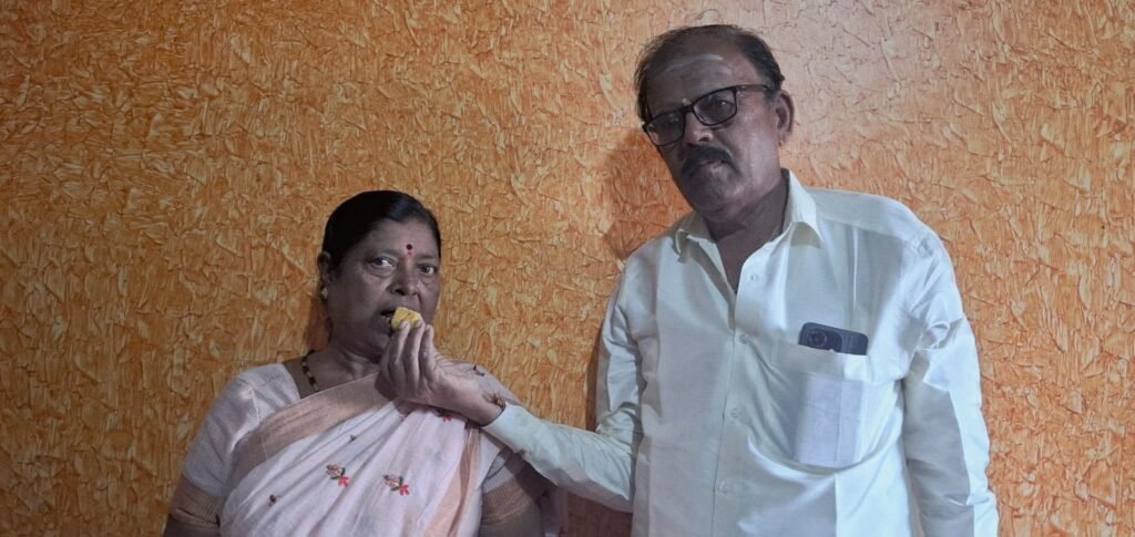 ಸಹಕಾರ ಸಂಘದ ನೂತನ ಉಪಾಧ್ಯಕ್ಷೆ ಜಿ.ಅಯ್ಯಮ್ಮಗೆ ಸಿಹಿ ತಿನ್ನಿಸಿ ಶುಭಾಶಯ ಕೋರಿದ ಪತಿ ಈಶಪ್ಪ.
